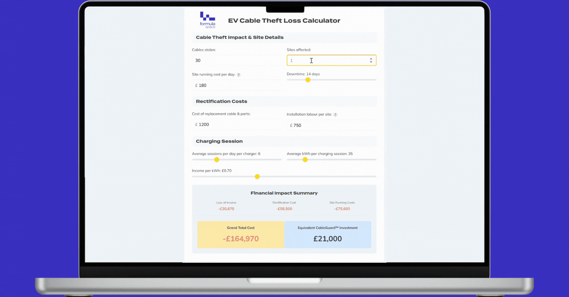 Use the sliders in our cable theft impact calculator to estimate the real cost of an incident on your network. Factor in replacement cables, engineer time, site running costs and the cost of your chargers being down.